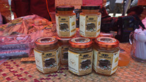 Stand pameran UMKM ini tidak hanya menjual madu alami dalam kemasan 160 ml dan 220 ml. Tapi, juga menjual permen gula merah dan kopi bubuk. Termasuk aneka jenis makanan ringan produk UMKM desa.