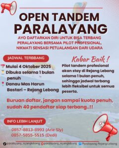 MEDIA CENTER REJANG LEBONG– Paralayang Rejang Lebong (Paralel) akan menggelar kegiatan open tandem paralayang mulai 4 Oktober hingga 4 November 2025. Kegiatan ini berlangsung di dua lokasi wisata, yakni Danau Mas Harun Bastari (DMHB) Kecamatan Selupu Rejang dan Bukit Basah Kecamatan Curup Utara.