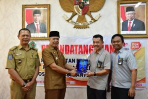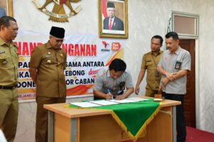 MEDIA CENTER REJANG LEBONG – Bupati Rejang Lebong Drs. H. Syamsul Effendi,MM menandatangani perjanjian kerja sama atau Memorandum Of Understanding (MoU) bersama PT. Pos Indonesia (Persero) Kantor Cabang Curup pagi tadi diruang rapat Bupati Rejang Lebong tadi siang (28/8/2023).