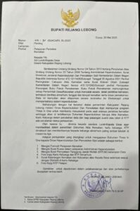 Untuk memperkuat pelaksanaan program ini, Bupati Rejang Lebong, H. Muhammad Fikri Thobari, SE, MAP telah mengeluarkan surat edaran kepada seluruh kepala desa dan lurah.